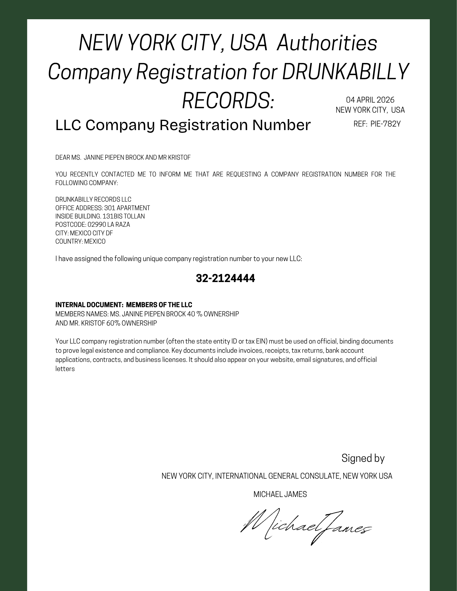 DRUNKABILLY RECORDS LLC COMPANY REGISTRATION DOCUMENT NUMBER
